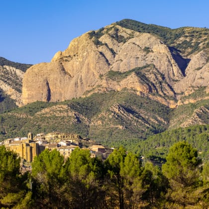 L’Aragon, 'ça commence' par l’envers du Cirque de Gavarnie, côté espagnol : avec les canyons d'Anisclo et de Pineta, leurs vires spectaculaires et le Mont-Perdu (3355 m, 3ème sommet le plus haut des Pyrénées) dominant les sierras qui se dessinent plus au sud. La plus célèbre d’entre elles est très certainement la Sierra de Guara, avec ses eaux turquoise ou émeraude, qui constituent un élément de prédilection pour la pratique du canyoning. Les sentiers en balcon au-dessus des falaises de calcaire blanc-ocre ou déambulant dans la garrigue, reliant villages en pierre et ermitages cachés sont un excellent prétexte à la randonnée à pied… ou même à VTT.